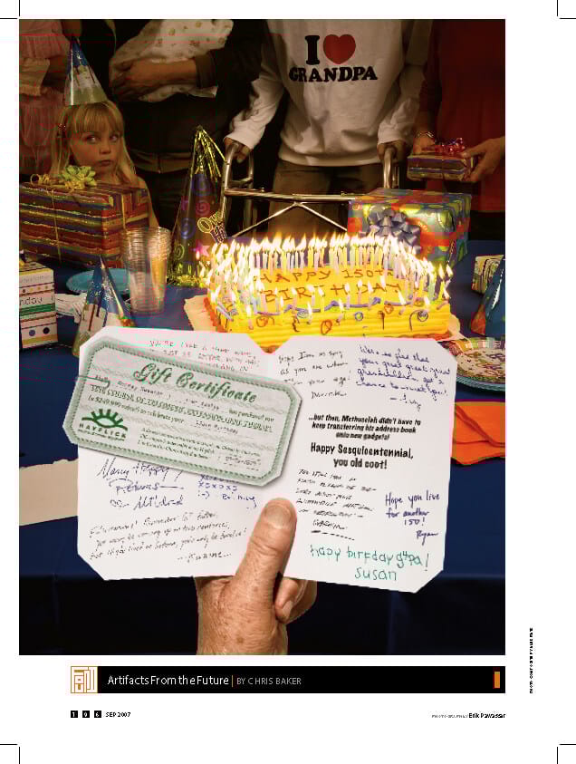 Found: 150th birthday partyA gift certificate for life extension cell therapy and a card signed by all of the great-great-great-grandchildren One of my favorite projects when I was an editor at Wired magazine was the monthly back-page item Found: Artifacts From the Future. Each installment was a full-page image of some found object from a speculative near future. All explanation of what the object was and how it worked had to be diegetic—i.e., the page had to explain itself entirely through context and in situ text, with no annotation or caption. This was a great challenge for me as a writer/editor and for all of the designers, illustrators, and photographers I had the pleasure of working with. These pages never made much of an impact online because the fun was always in the fine print—which rarely came through at web resolution. I’m republishing them here to drill down on those cool details.