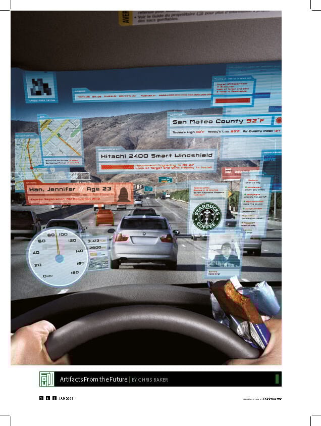 Found: Hitachi 2400 Smart WindshieldKeep your eyes on the road—through an overlay of maps, games, ads, chat windows, news reports, calendar alerts... One of my favorite projects when I was an editor at Wired magazine was the monthly back-page item Found: Artifacts From the Future. Each installment was a full-page image of some found object from a speculative near future. All explanation of what the object was and how it worked had to be diegetic—i.e., the page had to explain itself entirely through context and in situ text, with no annotation or caption. This was a great challenge for me as a writer/editor and for all of the designers, illustrators, and photographers I had the pleasure of working with. These pages never made much of an impact online because the fun was always in the fine print—which rarely came through at web resolution. I’m republishing them here to drill down on those cool details.
